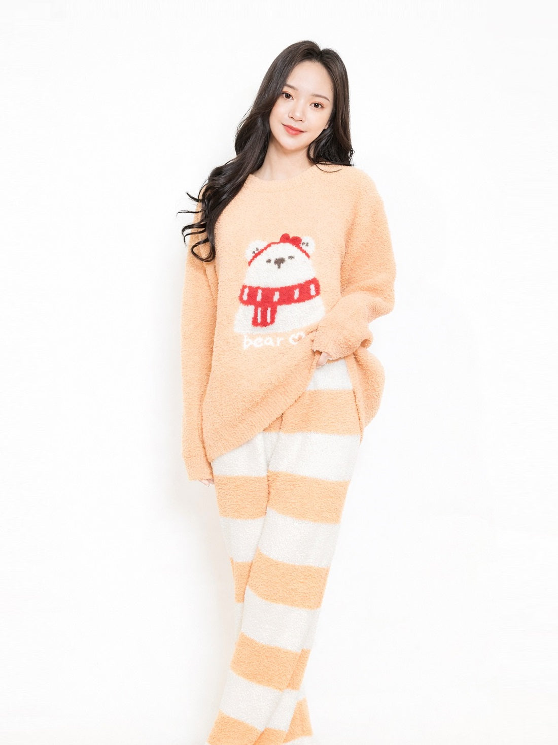 這款紅白條紋睡衣套裝,以柔軟蓬鬆的珊瑚絨材質打造,觸感如雲朵般細緻溫暖。上衣胸前可愛的小熊圖案搭配紅色圍巾,長褲則採用經典紅白橫條紋設計,俏皮又充滿節慶氛圍。